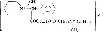 C23H40I2N2O3=646.39 CAS-3562-55-8 1-α-羧苄基-1-甲哌啶鎓碘化物二乙基[2-(2-羟基乙氧)乙基]甲基铵碘化物酯。 1-α-Carboxybenzyl-1-methylpiperidinium iodide diethyl[2-(2-hydroxyethoxy)ethyl]methylammonium iodide ester. 1-[2-[2-[2-(二乙基甲基铵基)乙氧]乙氧]-2-氧代-1-苯乙基]-1-甲哌啶鎓碘化物。 1-[2-[2-[2-(Diethylmethylammonio)ethoxy]ethoxy]-2-oxo-1-phenylethyl]-1-methylpiperidiniumiodide. 解痉药。 匹普罗扣纳里。 Piprocurarium Iodide,LD 2480,Brevicurarine. USAN.  |