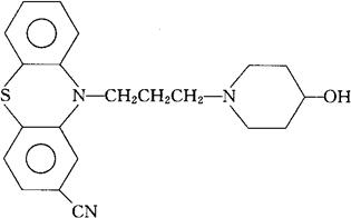 C21H23N3OS=365.19 CAS-2622-26-6 2-氰基-10-[3-(4-羟哌啶基)丙基]吩噻嗪。 2-Cyano-10-[3-(4-hydroxypiperidino)propyl]phenothiazine. 10-[3-(4-羟哌啶基)丙基]吩噻嗪-2-腈。 10-[3-(4-Hydroxypiperidino)propyl]phenothiazine2-carbonitrile. 抗精神病药。 Periciazine,RP 8909,SKF 20716,Propericiazine,Aolept,Pericyagine,Neulactil,Neuleptil. INN,BAN,DCF,DCIT,JAN,NFN,USAN.