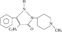 C17H23N3O=285.39 CAS-2531-04-6 4-乙基-1-(1-甲基-4-哌啶基)-3-苯基-3-吡唑啉-5-酮。 4-Ethyl-1-(1-methyl-4-piperidyl)-3-phenyl-3-pyrazolin-5-one. 4-乙基-1,2-二氢-2-(1-甲基-4-哌啶基)-5-苯基-3H吡唑-3-酮。 4-Ethyl-1,2-dihydro-2-(1-methyl-4-piperidinyl)-5-phenyl-3H-pyrazol-3-one. 镇痛药,解热药,解痉药。 哌普酮。 Piperylone,PR 66,Palerol. INN,USAN.  |