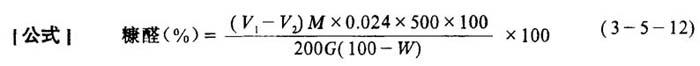 释义 | 四溴化法的测定计算 1.糠醛含量的计算 式中 0.024——与1mL1mol硫代硫酸钠溶液相当的糠醛量(g) 其它同式3-5-9 2.木材原料中多戊糖的计算 [说明]同二溴化法。 3.非木材原料中多戊糖的计算 [说明]同二溴化法。 |