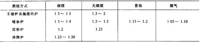 1.无烟煤、烟煤及贫煤  式中 Vy——烟气量(标准m3/kg) α——过剩空气系数  α0——炉膛过剩空气系数,见表6-2-4 表6-2-4 炉膛过剩空气系数α。  注:沸腾炉沸腾层过剩空气系数一般取1.15~120,炉子出口处需另加悬浮段漏风系数△α-01,对于其它炉窑,α可取1.3~17,对于机械式燃烧,α值取小些;对于手烧炉,α可取大些。 △α——烟气流程上各段受热面处的漏风系数,见表6-2-5 表6-2-5 漏风系数Δα  其它同式6-2-4 2.对 <12546kJ/kg的劣质煤  式中符号含义及单位同式6-2-13 |