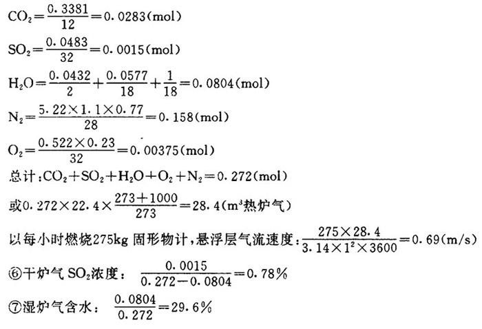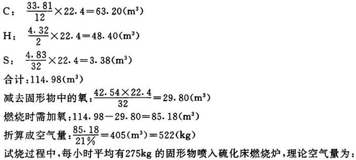 释义 | 国内某厂以硫化床试烧红液中间试验计算及实例 ❶ 设备特征 硫化床高2m,布风板直径1.1m,面积0.95m2; 扩散悬浮段直径2m,面积3.14m3,高5.5m; 悬浮层与布风板面积比: 炉膛总容积19.4m3; 硫化床布风板面积与炉膛总容积之比为1:20; 布风帽数59个,风帽开孔Φ7×8mm; 进风小孔总面积0.0183m2,开孔率: ❷ 炉料 石英砂、堆积密度1.542g/cm3,粒径及比例: 静止时料层厚680~730mm ❸ 试验用苇浆红液固形物元素分析: C:33.81% H:4.32% N:0.35% S:4.83% O:42.54% 灰分:14.15% 发热量13355.9kJ/kg(3190kcal/kg) 对100kg固形物的用氧量: