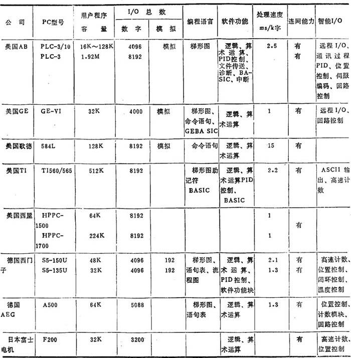 国外几种小、中、大型可编程序控制器的特性参数见表8.6-7~8.6-9。