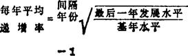 是指全国或某一地区范围内国民经济有关指标在一定时期(如五年、十年等)内,平均每年所递增(递减)的百分比,表明国民经济在一定时期内的平均增长(下降)速度。计算和考核国民经济平均递增(递减)率,对于谋求国民经济有计划、按比例发展和取得良好的经济效果有积极意义。 国民经济平均递增率的计算有几种方法,比较常用的是几何平均法,它是以间隔期最后一年的发展水平同基期水平对比,来计算整个间隔期内的平均增长速度,其计算公式如下:  式中, 代表国民经济指标平均递增率(如为负数,则表明平均递减率); n代表间隔年份(如按顺序年份计算,不包括基年); ao代表基年经济指标水平; an代表最后一年经济指标水平; -1由于计算其增长部分,所以扣除基数1或100%。 如用文字公式,可表示如下: