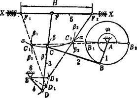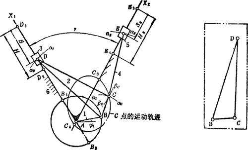 释义 | 图解法作平面机构的位置分析 位置分析的图解法,是按比例画出机构的位置图,用图表示分析结果,或由图求出未知的位置参数。 长度比例尺: 式中lAB为实际长度(m),AB为在机构简图中表示lAB的线段长度(mm)。 例5.3-1 V形发动机主体机构,如图示。 已知各构件尺寸、主缸中心线AX1与副缸中心线AX2的夹角y等。 位置图的画法:该机构为简单的六杆机构,当主动件——曲柄1的位置给定后,用简单的几何作图法即可作出主连杆2、主缸活塞——滑块3的位置,再作出副连杆4、副缸活塞——滑块5的位置。其作图步骤如下: ❶ 选取μ1;由各杆实际长度算出相应的图示长度。 ❷ 定出A点位置,画出AX1线、AX2线以及主动件--曲柄AB的某-位置( ❸ 以B点为圆心、BD为半径画圆弧aD-αD,由aD-αD弧和AX1线相交定出D点位置。 ❹ 以B点为圆心、BC为半径画圆弧aC-aC,再以D点为圆心、DC为半径画圆弧βc-βс,由这两个圆弧的交点定出C点位置。 ❺ 以C点为圆心、CE为半径画圆弧aE-aE,由aE-aE弧和AX2线相交定出E点位置。 在上述作图中,利用“圆弧与直线相交”、“两圆弧相交”往往会出现两个交点,这时应按机构的实际情况和运动的连续性定出正确的一点。 点的轨迹的求法;就该机构来说,当主动件AB回转一周,B点的运动轨迹是一个圆,而C点的运动轨迹是一个封闭的平面曲线。作C点的运动轨迹,可以将B点的轨迹圆周分为若干等份,得到主动件AB的若干位置;对其每一位置,均按上述方法画出相应的位置图,即可得到一系列C点位置,将其连成光滑曲线就是C点的运动轨迹。此外,也可以先将位置图中的BCD画在透明纸上(如上方双点划线框所示),作为“样板”,再将该样板覆盖在位置图纸上挪动,使B点在其轨迹圆上、D点在AX1线上;每挪动一次,就定出C点的一个位置;当B点沿其轨迹圆挪动一周,就定出一系列C点位置,将其连成光滑曲线即是C点的运动轨迹。 活塞(滑块)的位移和行程;当B点处于B1点位置时,D点处于上死点位置;当B点处于B2点位置时,D点处于下死点位置。图中H表示主缸活塞的行程,S表示其位移。以C点迹线上C3点(C4点)附近一段的各点为圆心、CE为半径画圆弧与AX2线相交,其中离A点最远(最近)的交点,就是副缸活塞的上死点位置E3点(下死点位置E4点)。图中SE表示副缸活塞的位移,HE表示副缸活塞的行程。 例5.3-2 印刷机翻纸机构,已知各构件尺寸。 该机构是复杂的六杆机构,属Ⅲ级机构。当主动件1的位置给定后,不可用“简单的几何”的作图法作出C点的位置。绘制位置图,必须先由四杆机构3-4-5-6画出C点的运动轨迹。 位置图的画法如下: ❶ 选取μ1;算出各杆的图示长度。 ❷ 定出转动副A、E点的位置,画出固定导路x-x的位置;给定φ1,画出主动件AB的位置。 ❸ 由四杆机构3-4-5-6,给出“主动件”DE一系列位置,画出该四杆机构的一系列位置图,画出C点的运动轨迹a-a。 ❹ 以B为圆心、BC为半径画圆弧β-β,β-β与a-a的交点即为与φ1对应的C点位置。 ❺ 再用几何作图法或样板法不难确定D点、F点的位置,即可画出完整的位置图。 行程的确定:画出机构的两个极限位置图,即可确定出构件5的行程H(如图):左极限位置为AB1C1D1EF1(构件1、2拉成一直线);右极限位置为AB2C2D2EF2(构件1、2重叠成一直线)。 |