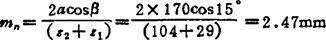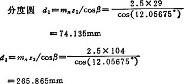 ❺ 确定齿轮主要参数和尺寸如下: 选取小齿轮齿数z1=29,则大齿轮齿数z2=uz1=3.6×29=104。 初选螺旋角β=15°,则得模数