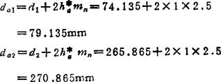 基圆 dL1=d1coSat=74.135cos(20.41426°) =69.479mm db2=d2coSat=265.865cos(20.41426°) =249.167mm 顶圆