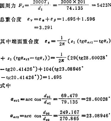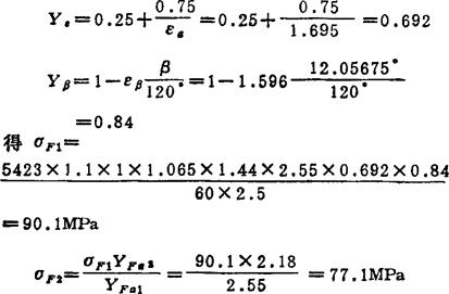 其中齿宽b=60mm,模数mn=2.5mm,齿形系数YFa1=2.55,YFa2=2.18(由图4.16-6查取);弯曲强度重合度系数