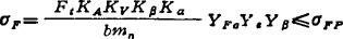 应力循环次数: NL1=60n1γt=60×380×1×8×300×8 =43.8×107 NL2=60n2γt=60×106×1×8×300×8 =12.2×107 工作硬化系数 ZW=1 接触疲劳强度最小安全系数(参阅表4.16-20) SHmin=1 σH<σHp2,即满足接触疲劳强度要求,不仅能达到预定的工作小时,而且还有较多的裕度,必要时可采用降低齿宽、中心距等措施。 ❼ 验算轮齿弯曲疲劳强度:按表4.16-16公式: