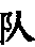 字源解说 “队”是“坠”的本字。队,甲骨文 表示抛崖天葬。当“队”的“抛葬”本义消失后,金文 加“土” 另造“坠”代替。但金文字形 中的“人” 像是被包裹、捆绑 (包裹的尸体),表明远古时代后期先民由抛葬发展成土葬,金文字形加“土” ,强调了土葬的含义。造字本义:先民将包裹、捆绑后的尸体进行抛葬或土葬。篆文 误将(包裹的尸体) 写成 (豕,猪)。隶书 将篆文的“阜” 写成“左耳旁” 。俗体楷书的“队” 恢复了甲骨文 的结构。古人称抛尸深谷的天葬为“坠”,称抛葬遗体的深谷为“壑”。 附 文言版《説文解字》:墜,陊也。从土,隊聲。古通用 。 附 白话版《说文解字》:墜,堕入。字形采用“土”作边旁,“隊”是声旁。古代“墜”通用于 。 引申线索