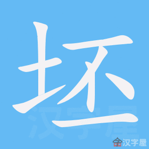 字源解说 “坯”(pī)是“坏”(pēi) * 的异体字。坏(pēi),金文--new/12pi/23jin00.gif)  ( ,即“郭”的本字,借代城墙) (不,否定),表示不可筑墙的材料。有的金文 用“才” (即“材”,建筑用料)代替“ ” (城墙):--new/12huai/21jin00.gif)  (不,否定) (才,即“材”,建筑用料),表示不宜使用的建筑材料,即未烧煅的、易断易碎的泥坯砖瓦。有的金文 误将略有变形的“才” 当成“土” 和折角形状的 ,误将“才” 写成了不知所云的 。篆文 将金文字形中本该是“才”的写成“土” 。隶化后楷书 将篆文字形中的 写成 。楷书异体字 用“丕” 代替“不” ,另造“坯”代替。造字本义:名词,不宜用作建筑材料的未烧煅的泥坯砖瓦。《汉字简化方案》中“坏”(pēi)合并了“壞”(huÀi)的义项;而“坏”(pēi)的本义则由“坯”(pī)代替。