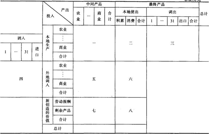 释义 | 地区价值型投入产出表 对一个地区按货币表现编制的投入产出表。 由于对调进产品的处理办法不同,地区价值型投入产出表分为方形和长方形两种形式。 地区价值型投入产出方形表 单位:万元 地区方形表与全国同类表的唯一区别,是最终产品部分增加了“调进调出差额”一列。 地区价值型投入产出长方形表 单位:万元 长方形与方形表的区别在于:(1)把调进产品分为五、六两个部分,放在本地产品的下面;(2)长方形表能详细地反映调进调出产品的来龙去脉,调进、调出部分的1,…,31表示我国包括台湾在内的31个省、市、自治区。 |