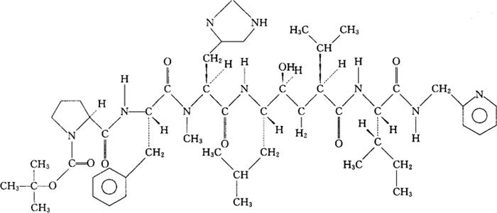 释义 | 地替凯伦 C50H75N9O8=930.20 CAS-103336-05-6 [1S-[1R*,2R*,4R*(1R*,2R*)]]-1-[(1,1-二甲基乙氧)羰基]-L-脯氨酰-L-苯丙氨酰-N-[2-羟-5-甲基-1-(2-甲基丙酸)-4-[[[2-甲基-1-[[(2-吡啶甲基)氨基]羰基]丁基]氨酸]羰基]己基]-N2-甲基-L-组氨酰胺。 [1S-[1R*,2R*,4R*(1R*,2R*)]]-[1-[(1,1-Dimethylethoxy)carbonyl]-L-prolyl-L-phenylalanyl-N[2-hydroxy-5-methyl-1-(2-methylpropyl)-4-[[[2-methyl-1-[[(2-pyridinylmethyl)amino]-carbonyl]butyl]amino]carbonyl]hexyl]-N2-methyl-L-histidinamide. 叔丁基(2S)-2-[[(aS)-α-[[(1S)-1-[[(1S,2S,4S)-2-羟-1-异丁基-5-甲基-4-[[(1S,2S)-2-甲基-1-[(2-吡啶甲基)氨甲酰]丁基]氨甲酰]己基]氨甲酰]-2-咪唑-4-基乙基]甲基氨甲酰]苯乙基]氨甲酰]-1-吡咯烷羧酸酯。 tert-Butyl(2S)-2-[[(aS)-α-[[(1S)-1-[[(1S,2S,4S)-2-hydroxy-1-isobutyl-5-methyl-4-[[(1S,2S)-2-methyl-1-[(2-pyridylmethyl)carbamoyl]butyl]carbamoyl]hexyl]carbamoyl]-2-imidazol-4-ylethyl]methylcarbamoyl]phenethyl]carbamoyl]-1-pyrrolidinecarboxylate. 抗高血压药(高血压蛋白原酶抑制剂)。 Ditekiren,U-71038. USAN. |