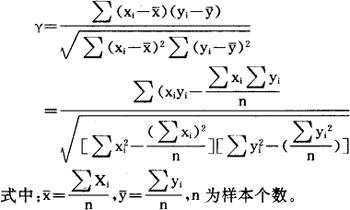 相关分析是测度各个变量(要素)之间的关系密切程度的数学方法。 在许多实际的地理问题中,经常遇到一些这样的问题,如:历年农作物的产量与面积的关系;城市人口与工农业产值、客运量的关系;人口增长与时间序列的关系等,它们之间都不能用数学公式确切的表达出来,变量之间的这种关系称为相关关系。同时由于试验、观测、判读过程中都存在著随机误差,致使绝大多数的地理变量间存在著相关关系。 相关分析方法在地学研究中早为人们所注意,并得到了广泛地应用。下面的简单直线相关系数为例说明变量间密切程度的测度。 变量之间的相关程度的测度方法视地理相关类型的不同而各异。根据地理相关类型相应的有以下几种相关系数:直线相关系数、相关指数、复相关系数、偏相关系数、等级相关系数等。 简单直线相关系数计算公式  γ∈〔-1,1〕 当|γ|=1时,说明二变量完全正相关(或完全负相关)。 当γ=0时,说明二变量完全没有关系。 即当 大时,说明二变量相关程度密切。 当 小时,说明二变量相关程度差。 例如济南多年月平均气温与5厘米深平均地温的相关关系研究如下。原始数据列入下表。 济南市各月平均气温与5厘米深平均地温(℃)  经计算,相关系数γ=0.9991,显著性水平(α)已达到0.001,可见二者之间相关程度极为密切。 |
