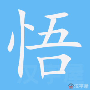 吾,既是声旁也是形旁,表示我、自身。悟,籀文=(两个五,即“吾”,我)+(心,本性),造字本义:明心见性、发现自我。古代禅师认为生的最高境界是体认自性,超越生死。篆文写成左右结构。隶书将篆文的“心”写成。古人称精通行军作战为“智”* ,称清心净虑、洞察真相为“慧” * ;称醒来感知清晰为“觉”* ;称明心见性、发现自我为“悟”;称简单无我、自然率性为“禅”* 。