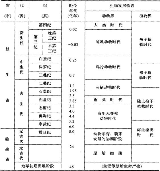 释义 | 地质年代 指地壳上不同年代的岩石在形成过程中的时间或顺序。有两种地质年代计算法:一种叫绝对地质年龄,是根据地层中放射性同位素蜕变产物的含量加以测定的。另一种叫相对地质年代,是以古生物的发展阶段来推断和划分的。(见下表)。 地质年代表 表中只列出地质时代单位,与其相应的地层单位则分别改称宇、界、系。 |