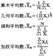 描述随机变量集中趋势的参数,代表随机变量分布的中心位置。有算术平均数、几何平均数、调和平均数、加权平均数几种均值。对应于随机变量X的N个观测值X1、X2,…XN时,下面给出各种均值()的计算公式: