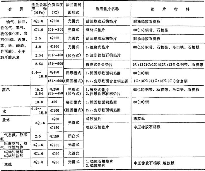 释义 | 垫片密封 垫片密封广泛用于管道、压力容器、箱体偶合面的静密封。常用的片有非金属垫片、金属垫片和二者的组合形式。常温低压下一般选用非金属软质垫片,因软垫片对偶合面的表面光洁度要求较低。中压高温时选用金属与非金属组合式垫片或金属垫片。如温度和压力有较大波动,宜选用弹性好的垫片。垫片的选用可参照表4.12-2及4.12-5。 表4.12-5 垫片选用标准* 注:*石油部垫片选用标准。 被密封表面的粗糙度,是影响密封性能的重要因素。如用金属垫片,其表面粗糙度推荐为Ra<0.8~1.6μm,金属包的非金属垫片推荐为Ra≤1.6μm,石棉橡胶板和聚四氟乙烯垫片推荐为Ra≤12.5μm,橡胶板和纸垫片推荐为Ra≤25μm。 |