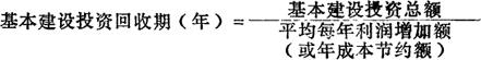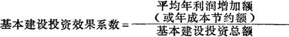 基本建设投资效果指标,是投入基本建设的资金同所获得的有用经济成果之间的比例关系。 社会主义基本建设的有用效果,表现在基本建设为国民经济各部门创造出来的工厂、矿井、铁路、公路、农场、住宅等设施的固定资金上。它是扩大社会主义再生产的重要手段,也是提高人民物质文化生活水平的基础。农业基本建设包括:兴修水利、植树造林、改良土壤、开荒造田、购置大型农具、增加设备、建造生产性和非生产性房屋等等。衡量和评价基本建设投资效果的常用指标是: (1)基本建设投资回收期。它表明基本建设投资的全部资金,从每年增加的利润量(包括税收)或从每年节约的成本费中收回来的年限。其公式是:  在其他条件相同的情况下,投资回收期越短,这一基本建设投资方案的经济效果就越好。 (2)基本建设投资效果系数。它是基本建设投资回收期指标的倒数,可以表明单位基本建设投资的经济效果大小。其公式是: