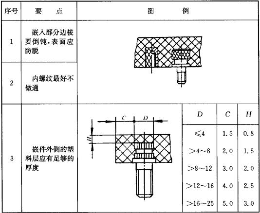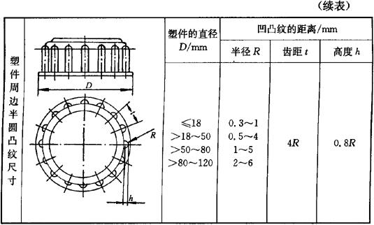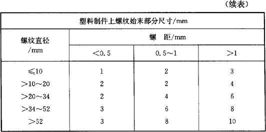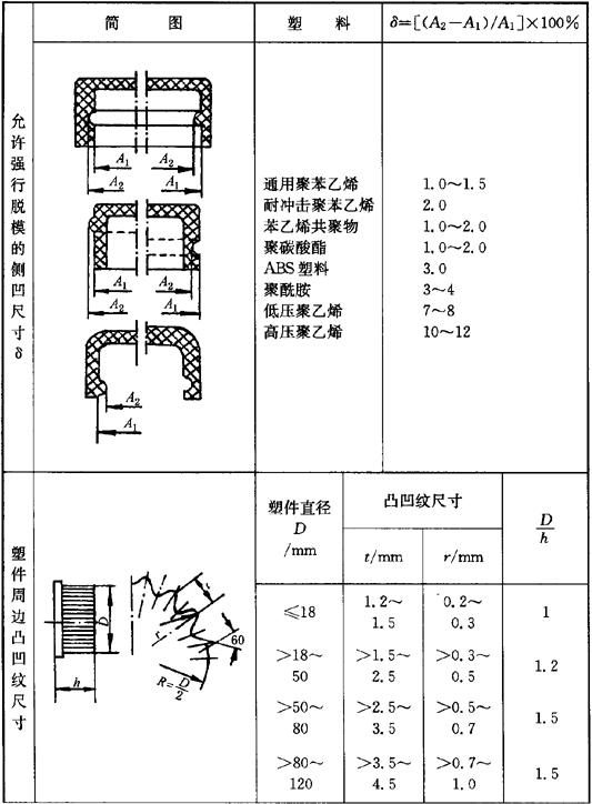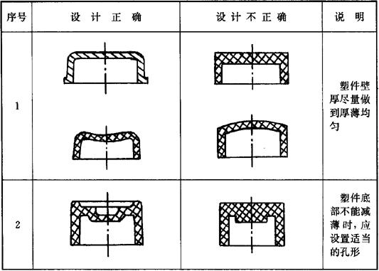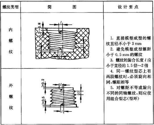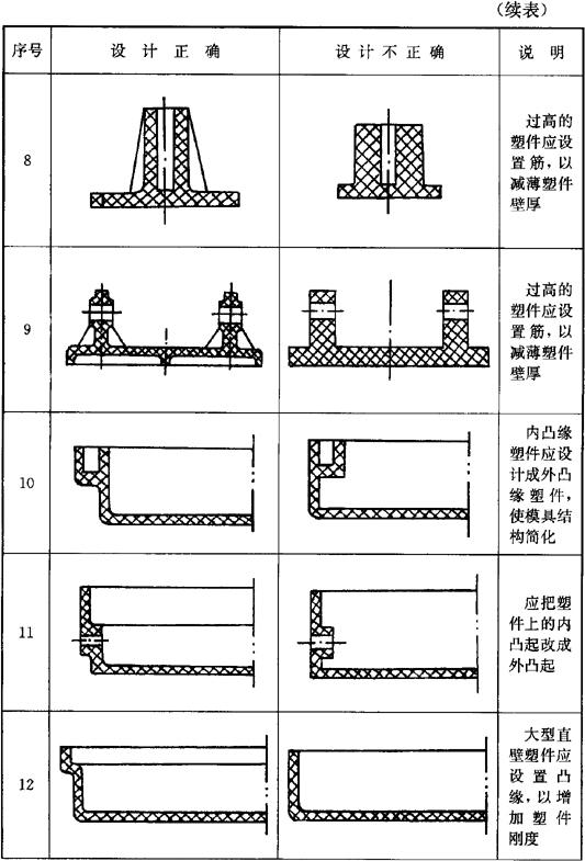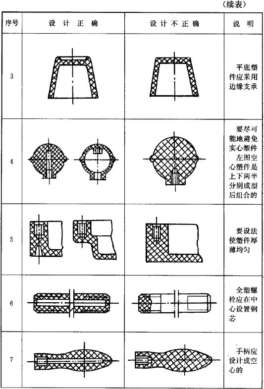 塑料制品的结构工艺性直接影响制品本身的性能指标、成型工艺的实施和模具结构的复杂程度。因此,模具设计人员必须熟悉与设计模具有关的塑料制品结构工艺性方面的要求。以便在满足使用要求的前提下,考虑塑件在模具中成型的特点,充分发挥所用塑料在性能上的优势,达到简化塑件及模具结构、降低生产成本的目的。 塑料制品结构设计的主要内容如下: 1.壁厚(见表2.2-29) 表2.2-29 常用塑料制品壁厚范围 (mm)    5.螺纹(表2.2-35) 表2.2-35 螺纹设计要点   6.金属嵌件(表2.2-36) 表2.2-36 嵌件设计要点  7.侧凸或侧凹(见表2.2-37) 表2.2-37 侧凸或侧凹   8.塑件结构设计示例(见表2.2-38) 表2.2-38 塑件结构设计示例    |
