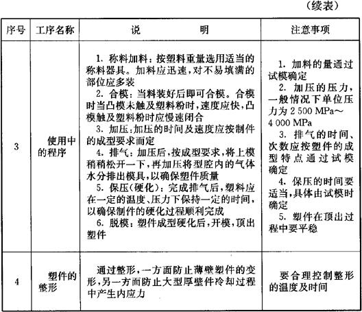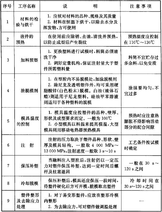 (一)压缩模的成型工序及使用方法 1.压缩模的成型工序与注意事项(表7.1-7) 表7.1-7 压缩模的成型工序与注意事项   2.模具使用注意事项 (1)开机前应仔细检查模具型腔内是否有其他杂物,以保持型腔内清洁,同时检查嵌件是否符合要求。 (2)在使用过程中,模具温度变化切勿过冷、过热,要缓慢均匀。 (3)卸件时要细心平稳,防止刮伤型腔表面。清理型腔,一般用压缩空气吹或用硬木制刮刀清除残料及杂物。 (4)适当使用脱模剂。 (5)模具在使用一段时间后,应定期检查型腔情况及下模底面有无污物。 (6)对模具的滑动部分,应定期加涂润滑剂。 (二)注射模的使用 1.注射模的使用程序及注意事项(表7.1-8) 表7.1-8 注射模的使用程序及注意事项  2.模具使用注意事项 (1)使用前须清理模具,保持清洁无异物。 (2)使用过程中对模具的活动部位如导柱、导套等应定期加润滑剂。 (3)在塑件脱模时,如发生粘模或难以取出时,可用铜锤或木质工具取出,不得用硬金属器物敲击。 (4)模具在使用一段时间后,应定期进行检查及维护保养。 |