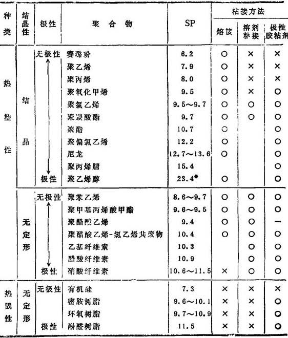 塑料的粘接方法一般分为三种: ❶ 溶剂粘接法;(2)热熔胶粘接法;(3)胶接剂粘接法。这三种方法应根据塑料的种类、性质以及粘接的对象而加以选择。热塑性塑料和热固性塑料基本性质不同。例如:对于酚醛塑料、脲醛塑料、密胺塑料、聚酯塑料等热固性塑料。因为这些是不溶、不熔性塑料,所以这些塑料的粘接不能用溶剂胶粘法和热熔胶粘接法,而只能用胶粘剂粘接。 热塑性树脂,由于分子构造的关系,有的对溶剂能溶解,有的对热比较敏感可熔融,对易溶于溶剂的可使用溶剂粘接法,对热敏感的可使用熔融粘接法。胶粘剂粘接法虽然适用于热塑性塑料,但主要是用于溶剂难以溶解的结晶性塑料的粘接和热塑性塑料与其它材料的粘接。对于能够使用溶剂粘接法粘接的塑料,其自身的粘接一般不使用胶粘剂粘接。此外,选择粘接方法时,还应考虑粘接件工作的条件。例如:粘接点上承受的应力大小、受热或者化学方面的环境条件,粘接件应具有的韧性以及被粘接体之间允许的位移等等。对粘接剂的选择还应考虑经济成本。各种塑料适宜的粘接方法可根据表5-1选用。 表5-1 聚合物的极性、SP及粘接方法  注:×——不可以,O——可以。 |