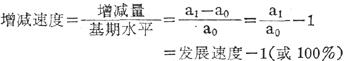 指报告期增减量对基期水平之比。 说明现象报告期水平比基期增或降若干倍或百分之几。正值为增长速度,又叫增长率;负值为降低速度,又叫降低率。 增减速度也可根据发展速度减1(或100%)计算。 反映被研究现象增长或降低程度的相对指标。计算公式为:  上式:a0代表最初水平,a1代表报告期水平。 增减速度有定基增减速度和环比增减速度。从定基发展速度或累计增减量计算的增减速度,为定基增减速度;从环比发展速度或逐期增减量计算的增减速度,为环比增减速度。两种增减速度不能直接换算。如果要换算,先将环比增减速度加1(或加100%)化为环比发展速度后,再连乘计算出定基发展速度,而后再减去1(或100%),求得定基增减速度。 |