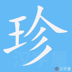 zhēn ❶名珠玉一类的宝物;泛指宝贵的东西。奇珍异宝|珍珠 →❷形贵重的;稀有的。珍禽异兽|珍品|珍贵 →❸名特指精美的食品。山珍海味|八珍|珍馐 →❹动看重;重视。自珍自爱|珍重|珍视 ○❺名姓。