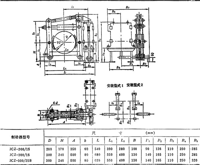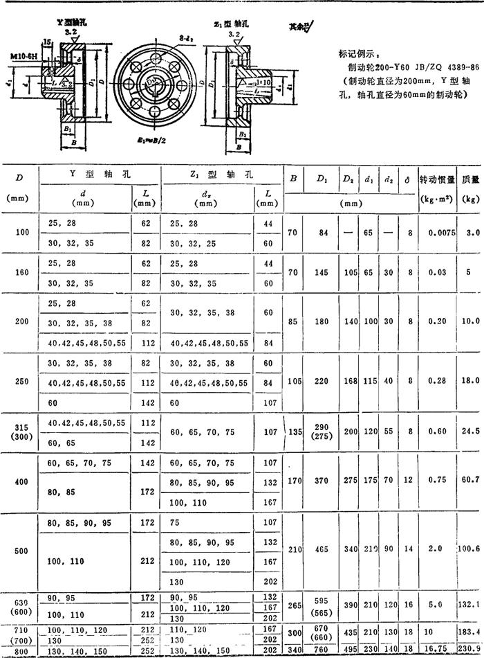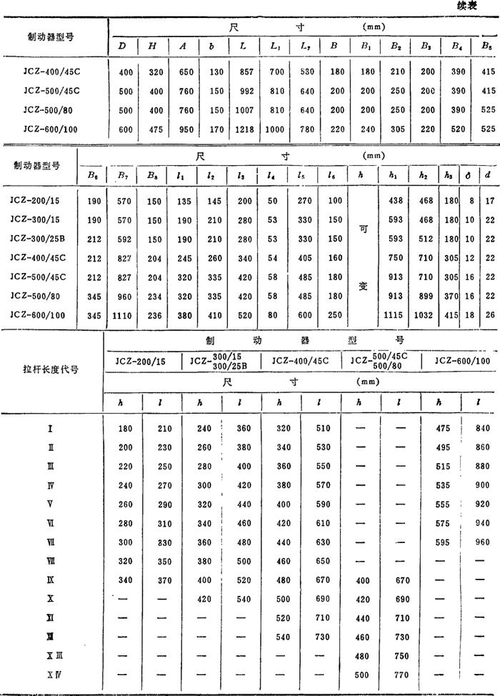 释义 | 外抱块式制动器 外抱块式制动器常用于起重运输设备等,多数为常闭式。其常用的结构形式如下: 3.1 常闭式长行程电磁液压制动器。 如图4.8-1所示,当驱动装置5中电磁线圈通电时,推杆上推,使制动臂3克服主弹簧2的推力而使制动器松闸。图4.8-2所示为主弹簧置于侧面的长行程电磁液压制动器。 1—制动瓦 2—主弹簧 3—制动臂 4—推杆 5—驱动装置 3.2 常闭式短行程电磁铁制动器。 如图4.8-3所示,其电磁铁有直流和交流电磁铁两种。图a)为交流电磁铁,动铁芯2绕轴1转动;图b)为直流电磁铁,动铁芯被吸合后可直接克服主弹簧力而松闸。 1—销轴 2、3—动铁芯 4—电磁线圈 5—驱动装置 3.3 常闭式无上框短行程制动器 如图4.8-4所示,当直流电磁铁通电吸合时,因压缩主弹簧而松闸。其特点是:弹簧力易调、磁铁间隙小(0.6~3.0mm)、动作快。 1—直流电磁铁 2—主弹簧 3—动铁芯 4—制动瓦 5、6、7—杠杆 8—销轴 9—基架 10—调整螺钉 3.4 短行程直流电磁铁块式制动器 如图4.8-5所示。 1—直角杠杆 2—调整螺钉 3—弹簧 4—手柄 5—动铁芯 外抱块式制动器的特点和应用见表4.8-5,常用的标准块式制动器的有关参数分别见表4.8-6~4.8-15。 表4.8-5 外抱块式制动器的特点和应用 注:拉杆长度根据中心高h选取。如果实长超出表内范围,允许按实际需要标注。 表4.8-13 制动轮(摘自JB/ZQ4389—86) 注:括号内尺寸不推荐使用。 |