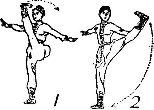 支撑腿自然伸直,全脚著地。另一腿从体内侧踢起经面前向体外侧作扇面摆动落下。动作轻快有力,上身正直。