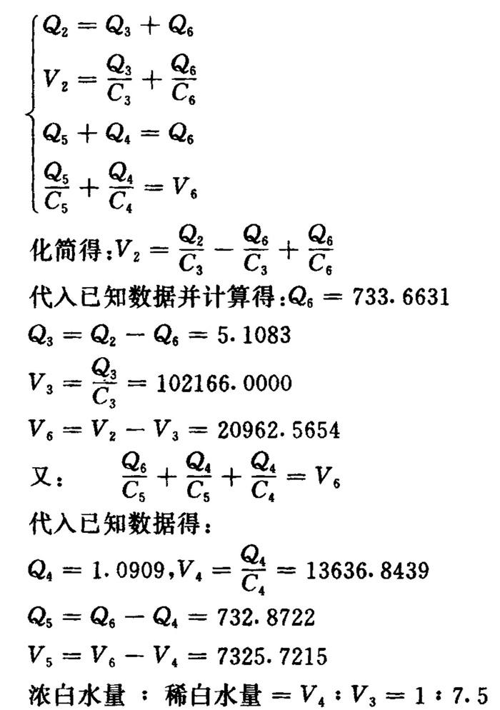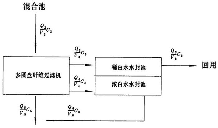 【已知】 Q2=738.7714,V2=123128.5654 【已知】 Q2=738.7714,V2=123128.5654 C3=50ppm,C4=80ppm,C5=10%,C6=3.5% 【说明】 多圆盘纤维过滤机在处理白水时,当纤维滤层没有形成时,白水浓度较高,随著纤维滤层的形成,白水浓度逐渐降低。因此,其排出水的白水有浓稀之分。在实际生产中,浓白水经过加压后全部用来剥离纤维层,供给的浓白水量恰好够纤维层的浓度由9~11%降至3~4%,如其稍有剩余或不足,可排入稀白水或由稀白水来补充。本例设其量恰好能使纤维层浓度由10%降至3.5%。 【计算】 根据平衡  【注意】 水封池排出的稀白水可循环使用,而回收浆也进入系统回用。 |