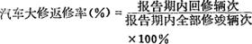 释义 | 大修返修率 汽车大修竣工检验出厂后达不到包用里程而回修的辆次占大修总修竣辆次的百分比。如大修车出厂后的返修车辆进厂不超过4小时修竣出厂,可以不计返修辆次;如同一车多次进厂返修,所占用车时,应累计计算;如累计超过4小时,进几次,算几次返修。其计算公式为: 1.按车次计算 2.按车日计算 |