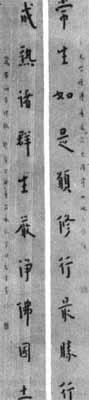 【简介】: 近代·弘一法师书于1936年。纸本。行书。凡上下联正文二十字,款二十四字,共四十四字。刊于《民国时期书法》(上),《中国书法》一九八六年第四期。 【赏析】: 弘一(李叔同)早年研习仿写北魏碑版有极深的造诣,笔法厚重浑穆,方而不扁。他还喜爱六朝写经,以爲眞趣可人。出家之后,弘一把对佛学的深刻体会和对世象的独特见解融入笔端,形成了与衆不同的书法风範。这行书十言联,扑面而来的气息能使观者心如秋水。字幅狭长,字形也狭长,如此地趋于一致,眞让人担心会平淡乏味!再看他的用笔,一槪削繁就简,旣无大起大落,又无曲折迴环,平平写来,不作波澜,但那些点画凝练质朴,骨力内含,似有篆意而偏具温润,似取法于八大山人而更见持重,终于还是弘一法师自己的线条。字势已拉长,结体这么疏朗,点画之间还相互避让,字间的空隙又那样广阔,岂但可以走马,简直能列队成阵。然而,松而不散,眞是难得的大手笔!虽是行书,无论点画之间还是字与字之间绝无牵丝连带,又不欹侧作态,相应相安,靠的是含蓄中的顾盼生意,其中流动著一股空灵之气,瀰散著一段恬淡之情。上、下联各有大半行长题,不但笔法,而且结体都和写联语所用的方法相同,保持了风格的统一,但是字形小得多,突出了主体上、下联的二十字,而且本身两相对称,又与联语大小相映成趣,于是和而不同,统一中有了对立。弘一的点画,看似平淡甚至单一,其实同样隐藏著矛盾和对立,凝缩处凝缩到不可再短,伸展处又伸展到近乎夸张,此联“是”、“成”、“群”、“严”等字就表现得格外明显,只是整个艺术氛围平淡得叫人不易觉察罢了。矛盾而不激烈冲突,平淡而有对比变化,这是弘一法师书法的过人之处。所以平淡不是简单,更不是乏味。笔下绝不缠绕,点画相让相安,沉著安评,不浮燥,无霸气,却又劲直不卑弱,一派空灵,一片平淡,这不正是这位身处于乱世的高僧其人其心的写照么?