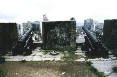 大炮台城堡位于大三巴牌坊不远处,原名圣保禄炮台。300多年前为防海盗,保护传教士及居民安全而建造的全澳门最大的炮台。它位于澳门柿山之巅,可以控制市区内外。 1622年6月24日,凭借著城堡上的大炮击退了荷兰人的入侵。这天正是圣约翰礼,于是圣约翰被视为澳门的主保圣人,这天也被定为澳门日,圣约翰浮像及“1622”的年份便刻在了城堡入口之上。当年那门古老的铁炮现仍安放于城堡上。 300年来,大炮台一直是军事禁区,平民百姓不得入内。1966年4月28日,澳门气象台迁到大炮台,从此它被辟为游览点,成为服务于澳门居民和外地游客的场所,每天上午7时至下午6时向公众开放。
