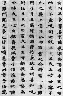 【简介】: 该卷写于北朝晚期。白麻纸质。缺首尾,99×26.4cm。存五十三行,行十七字。每行20.3×1.86cm。淸光緖二十五年(1899)在敦煌莫高窟藏经洞出土。现藏甘肃省博物馆。《敦煌遗书书法选》曾予刊印。 【赏析】:  这也是一件北朝写经中的佳作。章法有行而无列,渐脱前人写经之板滞;且又大小参差错落,随字画繁简而变化。结体宽松欹侧,有自得自娱的随意与自然。用笔飘拂舒展,鈎趯处虽然转向超过九十度角,也不著意调锋,而是顺著笔势自然送出。这些都显示著一种隷楷之间的意趣。但它毕竟已是北朝晚期的作品了。北朝写经正从古拙粗犷,走向淸雅流丽。点画用笔,则由大幅度的轻重提按与结字的奇险放纵,朝著平淡工整的路上走,爲后来的隋唐书风开闢先路了。这一特徵突出地表现在横画的起笔,它已不是北朝前期写经中那种露锋轻起、钝锋猛收的勇武刚强的外向风采,而是淸楚地运用空抢,使下笔处虽尙露锋,但却较前含蓄多了。至于其撇捺的丰腴规範秀美多姿,则更隐现著唐楷即临了。 |