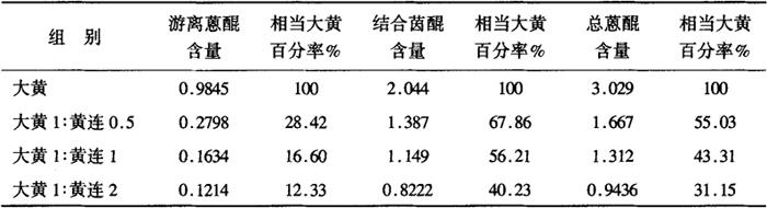 | 释义 | 大黄 黄连 【中医理论】 大黄2两,黄连1两,名“大黄黄连泻心汤”,见于《伤寒论》。两药都苦寒泄热,大黄,气味重浊,性善下行,泻营分之热;黄连善清热燥湿,泻气分之热。二药相伍,共奏清热泻下之功效。用法:以麻沸汤2升渍之,须臾绞去滓,分温再服。 【化学研究】 不同配伍剂量对大黄、黄连药对有效成分的影响〔1〕 1.大黄蒽醌类成分的测定 提取:称取定量药材,加水浸泡1h,煎煮30min(后下,煎10min),抽滤,残渣加水煎煮20ml,抽滤,残渣压榨,合并滤液和压榨液,水浴浓缩至规定浓度[含量测定浓度为10%(g/ml),泻下实验浓度为100%(g/ml)]备用。 含量测定:大黄中蒽醌类成分的测定:采用0.8%醋酸镁为显色剂,以大黄素为标准品,测定大黄和配伍组的蒽醌类成分的含量。黄连在510nm处对大黄蒽醌的测定几乎无影响(T>98%)。标准曲线的绘制:精密称取大黄素4.4mg,加甲醇溶解并定容至10ml,取其定容液0.5ml,加甲醇定容至10ml。精密吸取定容液0.1、0.2、0.8、1.6、3.2、5ml,分别加0.8%醋酸镁甲醇溶液定容至10ml,摇匀,于510nm处测定吸收度,绘制浓度—吸收度曲线,得回归方程为C(μg/ml)=0.0131+18.19Ar=0.9997。游离蒽醌的测定:精密取提取液2.00ml,加氯仿萃取4次,萃液回收氯仿,残渣用少量甲醇溶液,用0.8%醋酸镁甲醇定容至100ml,30min内用分光光度计在510nm处测定吸收度。由回归方程求得样品溶液中游离蒽醌含量,结果见表3-2-1。总蒽醌的的测定:精密取提取液2.00ml,加冰醋酸:25%盐酸(10∶2)20ml,沸水浴回流2h,取出放冷,用氯仿萃取4次,萃液回收氯仿,残渣用少量甲醇溶液,用0.8%醋酸镁甲醇溶液定容至100ml,30min内用分光光度计在510nm处测定吸收度。由回归方程求得样品溶液中总蒽醌含量,结果见表3-2-1。结合蒽醌的测定:测得的总蒽醌含量减去游离蒽醌即得样品溶液中结合蒽醌含量,结果见表3-2-1。 表3-2-1 汤剂中大黄蒽醌类成分的含量(mg/ml)及与单煎大黄的比较