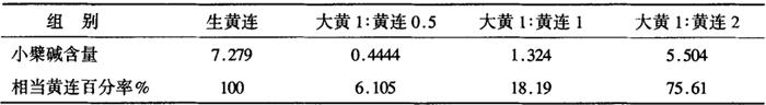 实验结果表明,大黄、黄连配伍后,汤剂中蒽醌类成分的溶出率显著降低。黄连的配伍剂量越大,汤剂中蒽醌类的含量越低。 回收率测定:平均值为97.02%±1.89%,n=4。 2.黄连中小檗碱的测定 用薄层层析与重铬酸钾对照法结合,适于成分复杂的含黄连制剂中的小檗碱测定。经薄层分离,大黄的成分对测定无影响。 精密取提取液10ml,80℃水浴蒸干,残渣用甲醇溶解并定溶至10ml,用微量注射器在硅胶板上条形(40mm×5mm)点样5μl,在正丁醇—冰醋酸—水(7∶1∶2)中上行展开15cm,挥干溶剂后于紫外灯下刮取亮黄绿色小檗碱斑点,置离心管中用40~50℃1%盐酸甲醇液10ml分3次洗脱,合并洗脱液于10ml容量瓶,加1%盐酸甲醇液至刻度,摇匀后供比色用。另于斑点旁刮取等面积空白硅胶,随行空白。取110℃4h干燥的重铬酸钾20mg,精密称定,置于100ml容量瓶中,加5mmol硫酸至刻度,供比色用。取样品液和重铬酸钾硫酸液,分别以空白硅胶洗脱液和5mmol硫酸液作为空白对照;于421nm处测定其吸收度。取黄连样品测定干燥失重,代入公式计算样品溶液中小檗碱的含量,结果见表3-2-2。 表3-2-2 汤剂中小檗碱的含量(mg/g/ml)及与单煎黄连的比较