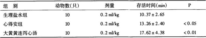 实验结果表明,大黄与黄连配伍后,汤剂中小檗碱的含量急剧下降,且大黄的配伍剂量越大,汤剂中小檗碱含量越低。 上述成分研究证明,大黄-黄连药对在复方煎煮时,由于黄连的小檗碱成分可分别与大黄的鞣质和蒽醌类成分反应生成难溶性沉淀物,结果汤剂中的蒽醌类成分和小檗成分的含量较之单煎药材均有所降低,而且降低的与两药的配伍比例有关,配伍比例相差越大,则被研究成分下降的程度也越大。 【药理研究】 1.抗缺氧作用[2] 1.1 抗常压下致整体缺氧作用 选体重23.45±2.19g的小鼠20只,随机分为2组,每组10只,试验组每只腹腔注射100%大黄黄连泻心汤水醇法提取液0.2ml/10g,对照组只注射等容量生理盐水,15min后将小鼠放入有10g钠石灰的25ml的广口瓶内,每瓶2只,加塞密闭观察小鼠的存活时间。结果试验组存活时间14.32±3.1min;对照组存活时间8.55±2.3min。两组存活时间差异非常显著(P<0.01)。 1.2 抗异丙肾上腺素致心肌缺氧作用 选21.75±1.76g的小鼠30只,随机等分为3组,分别由腹腔注射100%大黄黄连泻心汤水醇法提取液0.2mg/10g、心得安0.2mg/10g和等容量生理盐水。15min时,3组小鼠均由腹腔异丙基肾上腺素0.075mg/ 10g,15min后将小鼠置入250ml广口瓶内,记录其密闭后小鼠存活时间,结果见表3-2-3。 表3-2-3 大黄黄连泻心汤抗异丙肾上腺素致缺氧作用