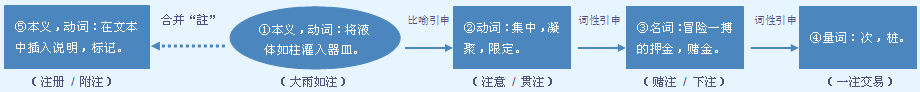 释义 | ![]() ❶灌。 a.作带宾、带补谓语。 ~水|给他~入了新鲜血液。 b.作宾语。 大雨如~。 ❷用文字来解释(字句)。可重叠。 a.作带宾、带补谓语。 他在这句话的后面~上了新的内容|这段文字太艰深,请你~一下|这些字句已经~了|这几个字应该~一~。 b.构成词组作定语,要带“的”。 古书的释义常用双行夹~的办法|这本书需要~的字句不多。 ❶指赌注。有时可单用,也可用在固定词组中。 赌场上一片混乱,他在上首下了一笔~|孤~一掷。 ❷指解释字句的文字。 a.作主语。 正文用大字,~用小字。 b.作宾语。 作者在这句话的后面加了~。 【近】 〈动〉❶灌 【词语】 注册 注脚 注解 注射 注释 注疏 注塑 注文 注销 注音 注重 字源解说 本 字“注” 主,既是声旁也是形旁,是“柱”的省略,表示直立的杆子。注,篆文 ![]() ![]() ![]() ![]() ![]() ![]() 合并字“註” 主,既是声旁也是形旁,是“注”的省略,表示灌入。註=言(言,说明)+主(主,“注”的省略,小心向小孔灌入),造字本义:比喻在文本中插入说明,标记。 附 文言版《説文解字》:注,灌也。从水主聲。 附 白话版《说文解字》:注,将液体从小孔灌入。字形采用“水”作边旁,“主”是声旁。 引申线索 ![]() 【字族索引】 主 【同音字】 zhù |