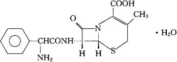 C16H17N3O4S·H2O=356.40 CAS-23325-78-2 (6R,7R)-7-[(R)-2-氨基-2-苯乙酰胺基]-3-甲基-8-氧代-5-硫杂-1-氮杂双环[4.2.0]辛-2-烯-2-羧酸一水化合物。 (6R,7R)-7-[(R)-2-Amino-2-phenylacetamido]-3-methyl-8-oxo-5-thia-1-azobicyclo[4.2.0]oct-2-ene2-carboxylic acid monohydrate. 抗生素类药。用于大肠杆菌、奇异变形杆菌引起的泌尿系统感染及链球菌引起的呼吸系统感染。 苯甘孢霉素,苯甘头孢霉素,头孢霉素Ⅳ,头孢力新,先锋霉素Ⅳ,头孢立新。 Cephalexin,Keflex,Keforal,Cefalexin. 头孢氨苄片(先锋霉素Ⅳ号片,苯甘孢霉素片),头孢氨苄胶囊(苯甘孢霉素胶囊)。 INN,BAN,BP,DCF,DCIT,JP,JAN,NFN,USAN,USP,MI.  |