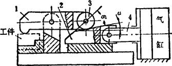 释义 | 夹持机构 为将工件固定以便执行作业的机构,通常称作夹具;而机械手或工业机器人用来抓取物件的手部,通常称作夹持手。获得足够的夹紧力,夹持牢靠,通常是设计夹具及夹持手的著眼点。在设计中、杠杆传动的增力特性、死点位置的传力特性、摩擦自锁特性、平行四边形机构中连杆的平动特性等被广泛利用。 例5.2-155 自锁式双升角快速夹紧机构 如图示,由气缸驱动的斜楔呈双升角楔形。大升角a1用来使构件1迅速接近工件;小升角a用来使构件1夹紧工件,并保持自锁。 例5.2-156 偏心圆盘凸轮控制的夹紧机构 这种机构在工作时转动偏心轮,可使杠杆式夹头压紧工件。其特点是结构简单,制造容易。适用于夹紧动作行程小、振动小的场合。 例5.2-157 浮动拉压夹紧机构 夹爪2、3铰接于机架,并由压簧相联。爪2的外侧呈凸块状。操纵杆1与右爪3铰接于A,杆1的滚子与爪2的凸块接触。当杆1绕A下摆时,夹紧工件;上摆时,在压簧作用下夹爪松开。 例5.2-158 利用死点自锁的夹紧机构 如图a),逆时针向转动手柄1,摇杆则带动压头4靠近工件。当1与连杆2成一条直线且处于铅直位置时,压头正好压紧工件,这时机构处于死点位置,工件不会自动松开。压头4的压紧位置及压紧力可由调整螺母调节。在图b)中,转动手柄2使其BC与摇杆CD成一直线,机构处于死点位置时,压头5正好压紧工件。压头5的压紧力和压紧位置由调整螺母调节。这种利用死点实现自锁的夹具,其自锁性虽不如摩擦自锁式,但结构简单,动作迅速。 例5.2-159 摩擦自锁式偏心轮夹具 如图示,偏心轮1与机架用销轴铰接于2r销轴,偏心距为e。顺时针向转动轮1手柄,则可将工件2压紧,且只要满足下述关系,便能使之处于自锁状态。 式中 ρ=rf,为销轴处的摩擦圆半径:a为楔紧角;φ为摩擦作用角。 例5.2-160 杠杆式夹持手 图a)为滑块-滑槽-杠杆式夹持机构。增大a角,可使夹紧力F1增大。但a过大将导致驱动气缸行程过大,一般取a=30°~45°。其特点是结构简单,动作灵活,手爪开闭角度大。图b)为滑块-连杆-杠杆式夹持机构。减小a角,可增大夹紧力F1。当a=0时,机构处于死点位置,这时即使去掉外力F,重物也不会把手爪推开而脱落。其特点是,可产生较大的夹紧力,铰链联结处摩损较小,但结构比较复杂,适用于抓取重量较大的工件。 例5.2-161 平行四边形机构式夹持手 图a)、b)均是以平行四边形机构的连杆作为夹头的,其特点是在夹持过程中夹头始终作定姿态平动。图b)可利用死点位置实现自锁。 例5.2-162 平行开闭式正-反螺旋夹持机构 机构中螺杆1的中部铰接于支座,两端为导程相同的反向螺纹,与左右两夹头构成螺旋副。当转动螺杆时,两夹头沿支座上的导路反向移动,同时夹紧工件或同时放松工件。通过设计螺纹升角,可实现摩擦自锁。 |
