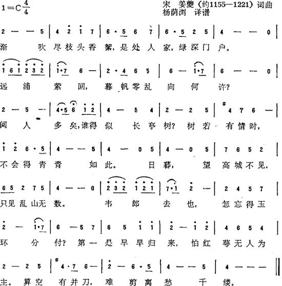 释义 | 夹钟宫 唐宋燕乐三十八调调名之一。 宋代俗称“中吕宫”,属七宫,为宋词主要乐调。元燕南芝菴的《唱论》认为“中吕宫”的声情是“高下闪赚”。 这“闪赚”,指忽隐忽现的变化,“高下闪赚”,是说夹钟宫的旋律形式有跌荡跳脱的特点。 本调的律吕字谱用黄、太、夹、仲、林、南、无、黄清、太清、夹清十律,即旁谱用ㄙ(合)、マ(四)、 本调的音阶、音域、结音(依杨荫浏说)如下表。(明体表示本调所用的音,黑体表示本调所本调所用的结音。 ) 予颇喜自制曲,初率意为长短句,然后协以律,故前后阕多不同。桓大司马云:“昔年种柳,依依汉南;今看摇落,凄怆江潭;树犹如此,人何以堪!”此语予深爱之。 |
