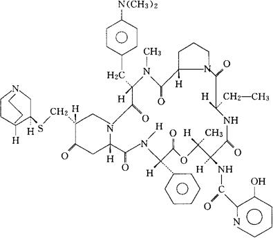 C53H67N9O10S=1022.23 CAS-120138-50-3 N-[(6R,9S,10R,13S,15aS,22S,24aS)-22-[对-(二甲氨基)苄基]-6-乙基二十二氢-10,23-二甲基-5,8,12,15,17,21,24-七氧代-13-苯基-18-[[(3S)-奎宁环硫基]甲基]-12H-吡啶并[2,1-f]-吡咯并[2,1-1][1,4,7,10,13,16]氧杂五氮杂环十九炔-9-基]-3-羟甲吡啶酰胺。 N-[(6R,9S,10R,13S,15aS,22S,24aS)-22-[p(Dimethylamino)benzyl]-6-ethyldocosahydro-10,23-dimethyl-5,8,12,15,17,21,24-heptaoxo-13-phenyl-18-[[(3S)-quinuclidinylthio]methyl]-12Hpyrido[2,1-f]-pyrrolo[2,1-l][1,4,7,10,13,16]oxapentaazacyclononadecin-9-yl]-3-hydroxypicolinamide. 抗菌药。 Quinupristin. INN,USAN.