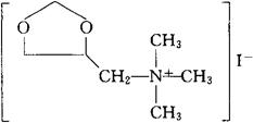 C7H16INO2=273.11 CAS-541-66-2 CAS-5818--18--8(oxapropanium) (1,3-二氧戊环-4-基甲基)三甲基铵碘化物。 (1,3-Dioxolan-4-ylmethyl)trimethylammonium iodide. N,N,N-三甲基-1,3-二氧戊环-4-甲烷铵碘化物。 N,N,N-Trimethyl-1,3-dioxolane-4-methanaminiumiodide. 神经阻断药,抗高血压。 噁戊碘铵。 Oxapropanium Iodide,2249 F,Vasodilatateur,2249F,Dilvasene. INN,USAN,MI.  |