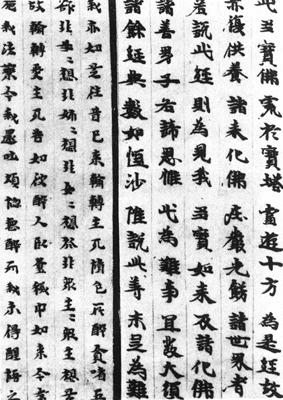 释义 | 妙法莲华经卷第六 【简介】: 北魏写经。白麻纸质。753×28cm。存四百一十三行,行十七字。每行23.4×1.9cm。淸光緖二十五年五月(1899),在敦煌莫高窟藏经洞出土,解放后由王封夫先生捐献,入藏敦煌县博物馆。《敦煌遗书书法选》曾予刊印。 【赏析】: 本卷墨迹行笔放纵舒展,但又顿挫分明,有些撇笔的收笔处还加有一个明显的迴锋,遇到有纵笔的短横,则肆意尽穿左竪。这是写经者爲了追求速度而又不碍辨识所採取的一种“惯性”的书写方法,当时写经中率多此例,可见写经者迅起急收的利落势态。 |