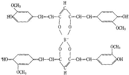 释义 | 姜黄素比色法 利用硼与姜黄素作用生成玫瑰红色的玫瑰花青苷的反应测定硼的一种比色方法。 姜黄素又称姜黄或郁金黄(curcumine)其化学式C21H20O6,以酮型和烯醇型存在。在酸性介质中姜黄素与硼结合成玫瑰红色的络合物,即玫瑰花青苷(rosocyanim),它是两个姜黄素分子和一个硼原子络合而成:该络合物检出硼的灵敏度是所有比色测定硼的方法中最高的(摩尔吸收系数ε550=1.80×105),最大吸收峰在550nm处,溶液在0.0014~0.06mg/kgB的浓度范围内符合Beer定律。 在比色测定B时,应严格控制显色条件,以保证络合物的形成。该络合物溶于酒精后,在室温下1~2h内稳定。 |