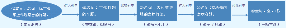 相,既是声旁也是形旁,表示瞭望、观察。箱,籀文=(竹)+(相,观察),造字本义:远古时代用轻质材料的竹子搭在战车上的观察架。篆文承续籀文字形。附《説文解字》:箱,大車牝服也。从竹,相聲。附《说文解字》:箱,大车上罩母马的装饰。字形采用“竹”作边旁,“相”是声旁。