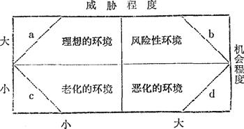 任何一家企业总是面临著不同的威胁与机会的组合,其组合形式如下图:  “威胁一机会”矩阵图 在a区中,机会程度大,威胁概率小,对企业是一个理想的环境。 面对这种环境,企业应不失时机地发展生产,扩大经营。在b区中,机会程度大,威胁的概率也大。对企业是一个风险性的环境。面对这种环境,企业对于自己的经营发展,应在预测的基础上,作出正确的决策。 理想的市场环境是不多见的,而风险性市场环境却较常见。善于经营的企业,就应在风险性环境中捕捉经营机会,及时作出正确的经营决策。 在c区中,威胁概率小,机会程度也小,对企业是一个老化的环境。处于老化环境的企业,在进行维持性经营的同时,一是要积极寻求新的经营机会,开发新产品;二是要积极开拓新的市场面。 在d区中,机会程度小,威胁概率大,对企业是一个恶化的环境。处于恶化环境的企业,应迅速摆脱这样的经营环境,尽快开拓新的经营途径。 |
