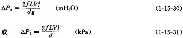 式中 △P2——孔段中的压头损失(mH2O或kPa) f——摩擦系数,可取0.012 L——该段孔的长度(m) d——该段孔的直径(m) Vi——该段孔中的流速(m/s) g——重力加速度(9.81m/s2) |