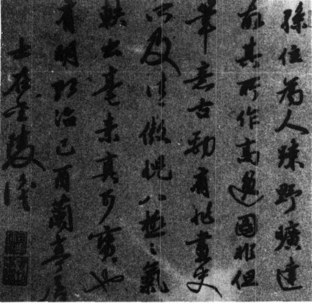 【简介】: 明·司马垔书于弘治二年(1489)。纸本。行书。竪45.3cm。上海博物馆藏。刊于《中国古代书画图目》(二)。 【赏析】: 比起司马通伯六年前在米元晖画后的那篇跋书来,这几行字给人的感受则绝然不同。那种如綉阁女子挑针引线般的精细柔和劲儿在这裏代之以犷勇与干练的阳刚之气。  在快速度的书写之中,笔势俯仰翻腾;单字外廓呈不规则多边形,骨格嶙峋;锋芒所出如鹰隼啄爪,锐利无比。细劲的线条在这种造型结构中愈见坚韧,富于穿杀力。有趣的是,作品中有些字的造型如“史、所、可、也”均能使人联想到具象的鹰及其动势—结构时间伴随著激越的旋律迅速推进。行间几个外形稍大的字的闪现,不仅适时地显示节奏感的强弱,而且那夸张的线形本身业已构成一种克服空气流阻力的巨大冲击力—在篇幅中这几个字起到了“诗眼”般的点化作用。书法的意象把诗一样的激情引向云霄那高阔豁远的境界。 |